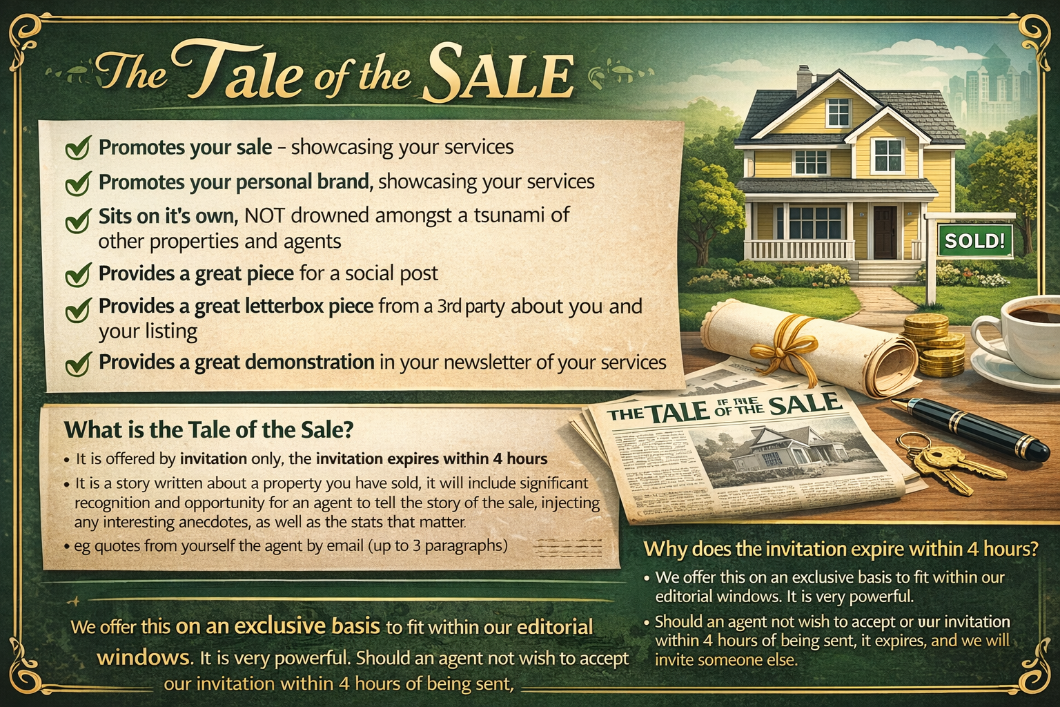 It is a story written about a property you have sold. It will include significant recognition and opportunity for an agent to tell the story of the sale, injecting any interesting anecdotes, as well as the stats that metter. It includes promotion across the relevant area to the relevant demographic.