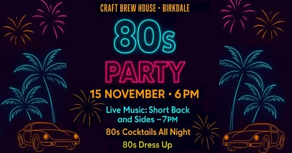 Dance back in time at this fun 80s party featuring your favourite throwback tunes. Dress up, grab a brew, and let the nostalgia take over.